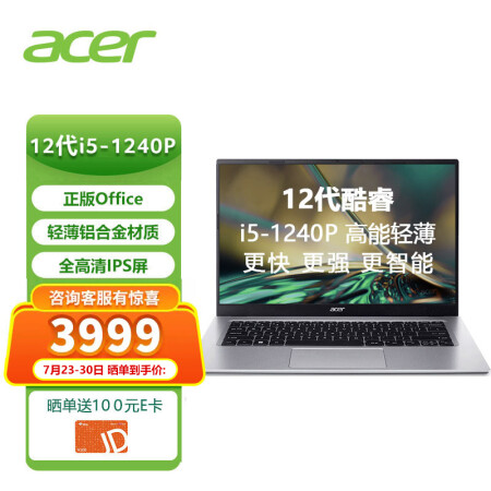 宏碁 Acer 全新12核超能金屬輕薄本 14英寸辦公學生筆記本電腦 i5-1240P 16G 512G 全高清IPS Office